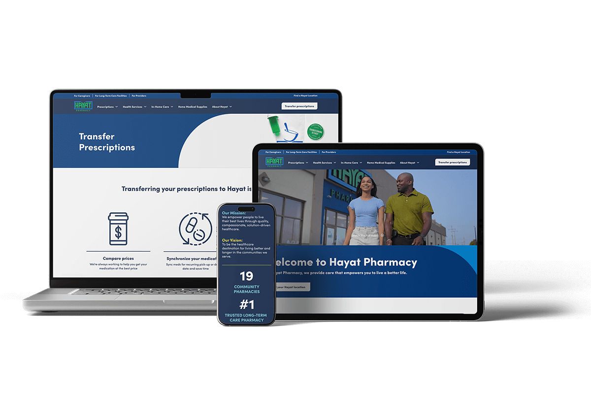 Where Milwaukee’s diverse communities once lacked in accessible pharmacy care, Hayat Pharmacy stepped in to address this issue. Now with 19 pharmacies and dispensing centers, Hayat has become the healthcare destination in those areas, offering free prescription delivery, medication packaging, and in-home visits and care across Southeastern Wisconsin. We wanted Hayat to remain a pillar in their community and compete with national players while staying true to its heart. Here’s how we told their story rooted in human connection for a cohesive and unified brand.